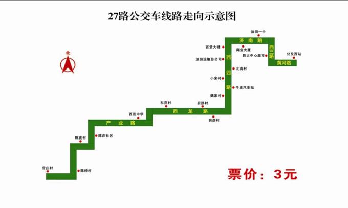 該線路自公交西站始發(fā),經(jīng)黃河路、西三路、濟南路、西四路、西龍路(前邵村、后邵村、東范村)、35隊路、產(chǎn)業(yè)路(西范中學(xué))、陳莊社區(qū)、陳橋村,到達終點站官莊村,該線路單程40公里,投入1部車運行,日運行4個班次,實行一票制,票價為3元/人。