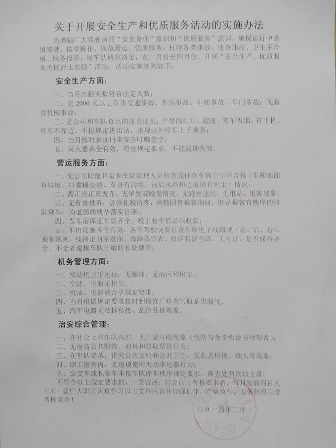為增強(qiáng)廣大駕駛員的“安全責(zé)任”意識(shí)和“優(yōu)質(zhì)服務(wù)”意識(shí),促使駕駛員出車前做好車輛檢查和衛(wèi)生保潔,運(yùn)行中謹(jǐn)慎駕駛、優(yōu)質(zhì)服務(wù),收車后規(guī)范停車,減少各類違章違紀(jì)、服務(wù)投訴和行車事故,杜絕單車衛(wèi)生不合格和不收款現(xiàn)象發(fā)生,實(shí)現(xiàn)職工薪金跨年度平穩(wěn)過(guò)渡,市公交公司汽車三隊(duì)充分利用部分工資結(jié)余,發(fā)揮經(jīng)濟(jì)杠桿作用,自2014年2月份起制定實(shí)施了“安全生產(chǎn)和優(yōu)質(zhì)服務(wù)考評(píng)獎(jiǎng)勵(lì)辦法”。