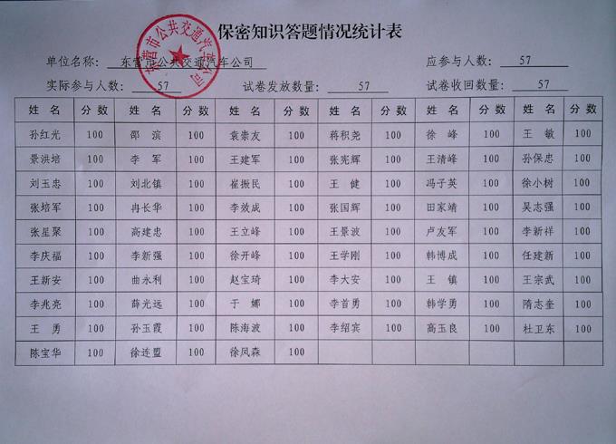 今年是新修訂保密法頒布5周年,保密法實(shí)施條例頒布1周年,也是全國“六五”保密普法教育收官之年。為進(jìn)一步增強(qiáng)公司管理干部保密法制觀念,提升管理干部綜合管理水平,市公交公司于6月5日至10日組織公司57名管理干部參加了全省保密知識(shí)答題活動(dòng)。答題方式采取試卷答題卡方式進(jìn)行,合格率均達(dá)到了100%。