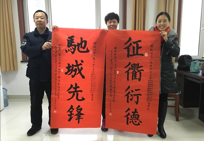 12月23日上午,家住雅苑小區(qū)的兩名乘客來(lái)到公交公司汽車六隊(duì),將親手寫的三幅毛筆字作品交到了車隊(duì)工作人員手中。