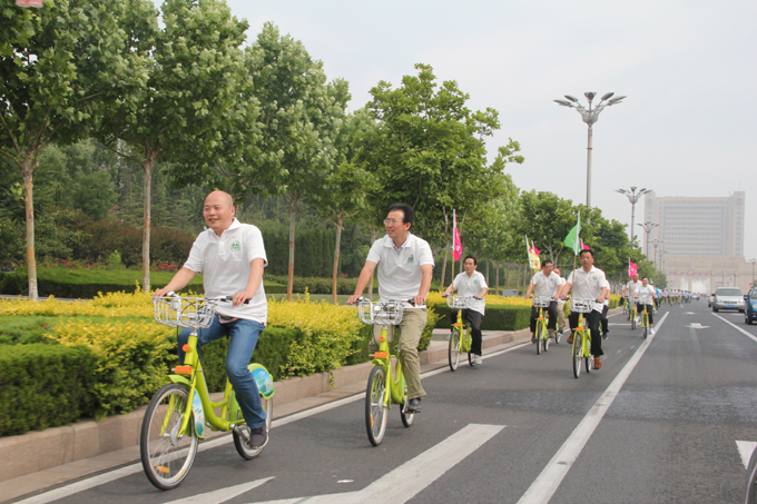上午九時(shí),來(lái)自市公交公司和環(huán)保局的70余名志愿者匯集在黃河影劇院停車(chē)場(chǎng),統(tǒng)一騎行公共自行車(chē),身著統(tǒng)一環(huán)保T恤,由黃河影劇院出發(fā),行經(jīng)府前大街—?jiǎng)倮蠼帧獮H河路—東三路等東城區(qū)主要繁華路段,開(kāi)展了浩浩蕩蕩的綠色騎行宣傳活動(dòng)。