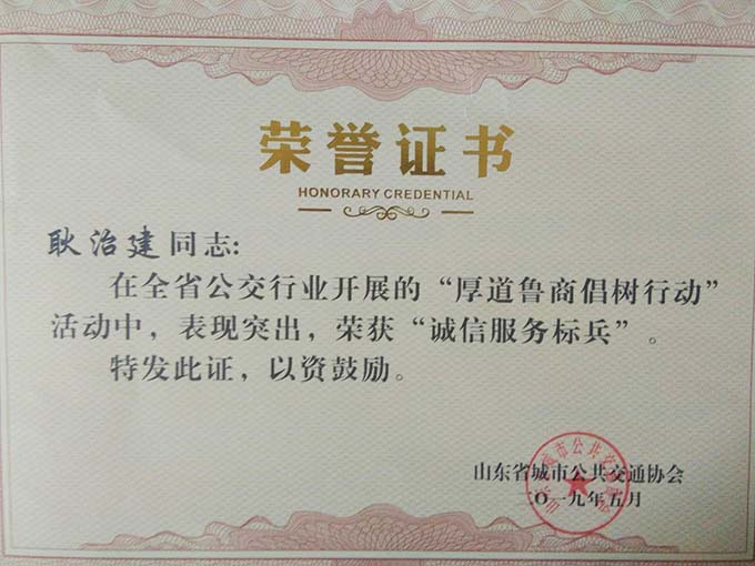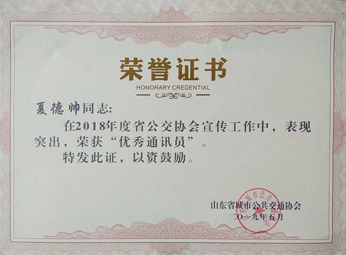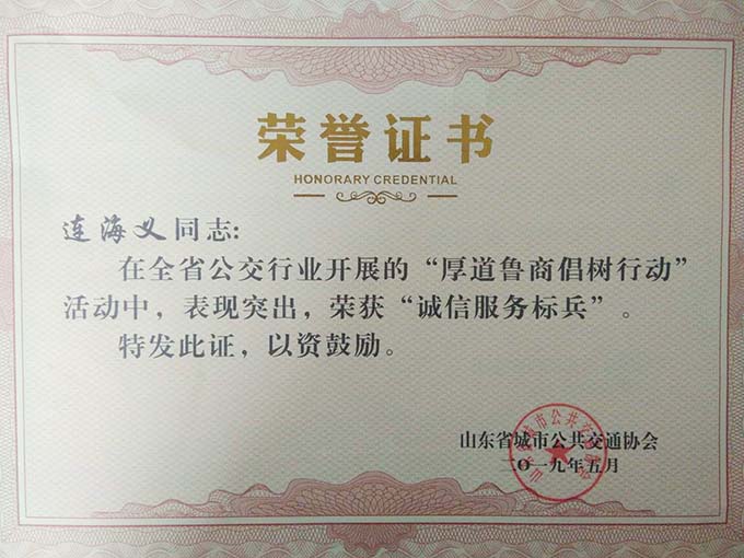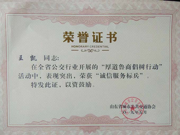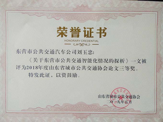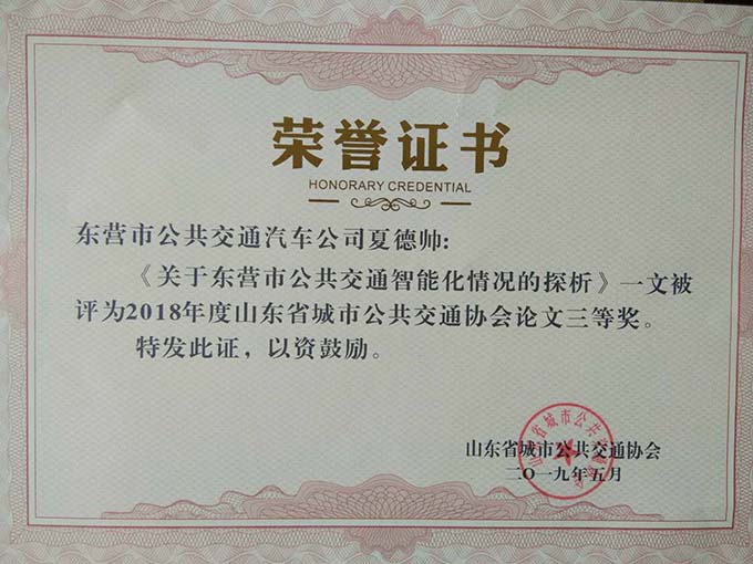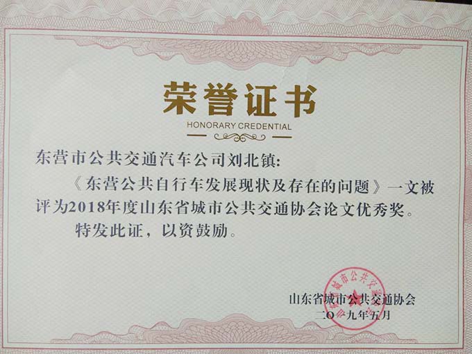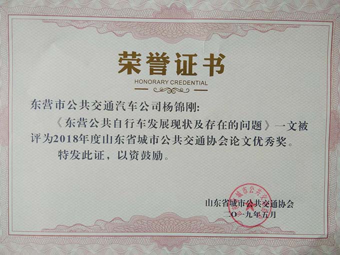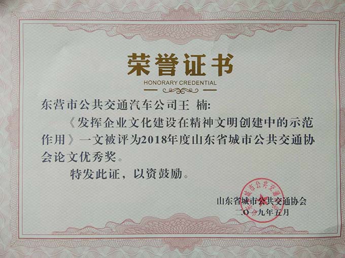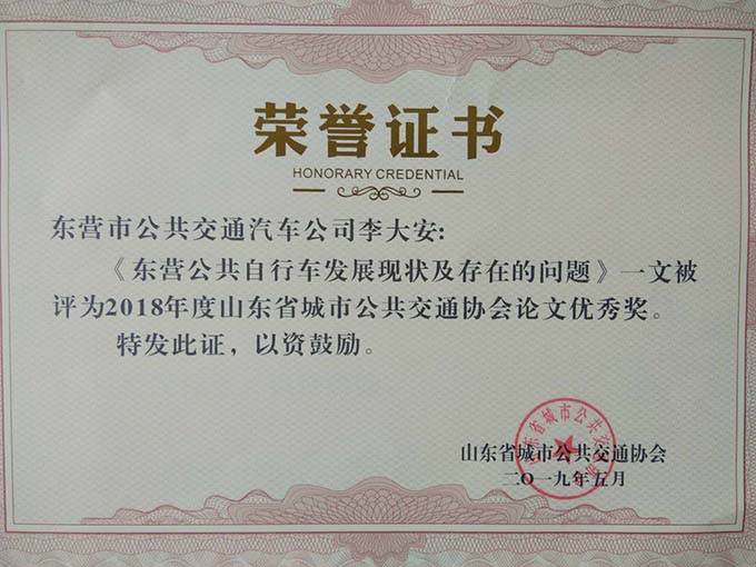 大會分別表彰了厚道魯商誠信公交企業(yè)、線路、標兵及宣傳工作先進單位、優(yōu)秀通訊員和優(yōu)秀研究成果論文。公司獲得山東省城市公共交通行業(yè)厚道魯商倡樹行動“誠信經營企業(yè)”和山東省城市公共交通行業(yè)宣傳工作“先進單位”榮譽稱號,9路車組獲得 “誠信公交線路”榮譽稱號,公司王凱、耿治建、連海義等三名同志獲得全省公交行業(yè)“誠信服務標兵”榮譽稱號,夏德帥同志獲得全省公共交通行業(yè)“優(yōu)秀通訊員”榮譽稱號。由公司選送的《關于東營市公共交通智能化情況的探析》《發(fā)揮企業(yè)文化建設在精神文明創(chuàng)建中的示范作用》《東營公共自行車發(fā)展現狀及存在的問題》等3篇論文分別獲得三等獎1項,優(yōu)秀獎2項,并成功入選全省城市公共交通行業(yè)優(yōu)秀論文集。