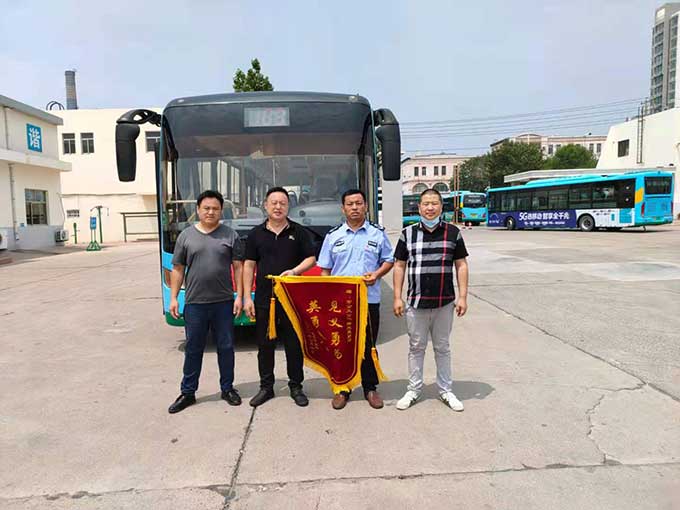 7月11日上午,市民王云峰和家人帶著繡有“見義勇為、英勇救人”的錦旗來到市公交公司汽車一隊,感謝103路駕駛員商光亮的救人之舉。