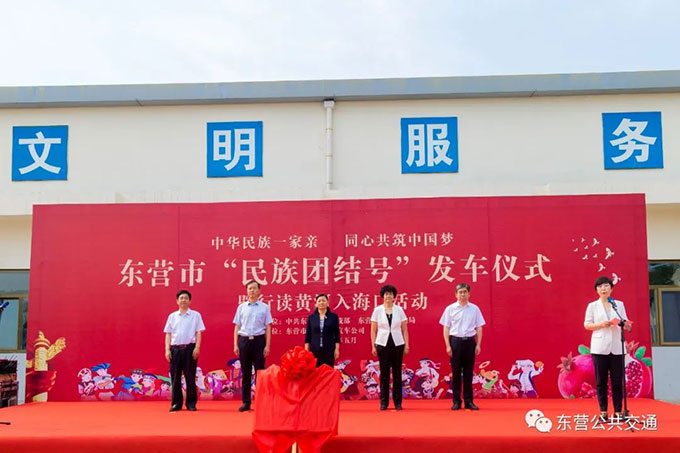儀式現(xiàn)場,民族團結(jié)號公交車整裝待發(fā),車身煥然一新,貼有“中華民族一家親、同心共筑中國夢”“各民族像石榴籽一樣緊緊擁抱雜一起”等字樣,融入東營民族團結(jié)進步“石榴籽”“石榴花開黃河口”等地域元素,生動展示了各民族群眾在黃河入海口攜手團結(jié)奮斗、共創(chuàng)美好生活的故事,市公交公司黨委書記趙龍同志現(xiàn)場就民族團結(jié)號公交車籌備情況作了匯報。市交通運輸局黨組成員、市鐵路港航發(fā)展中心主任朱勝勇致辭,市人大常委會副主任張敏,市政協(xié)副主席王新明為東營市民族團結(jié)號揭牌,市委常委、統(tǒng)戰(zhàn)部部長郭艷發(fā)表講話,并宣布東營市民族團結(jié)號發(fā)車。