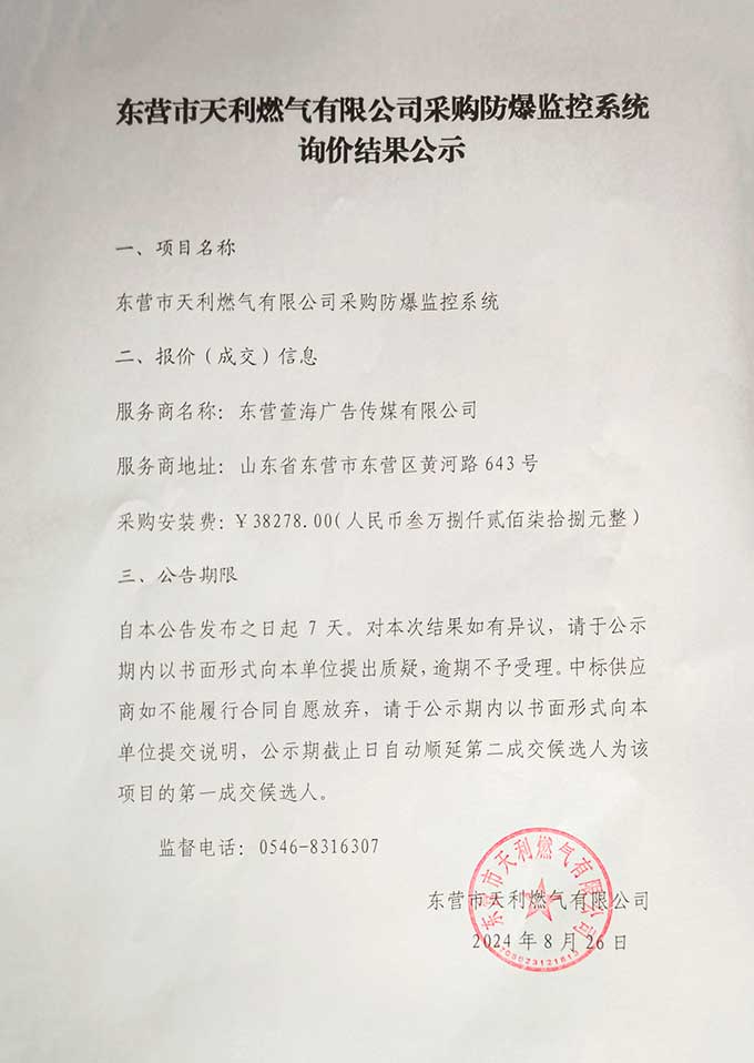 東營市天利燃?xì)庥邢薰静少彿辣O(jiān)控系統(tǒng)詢價結(jié)果公示