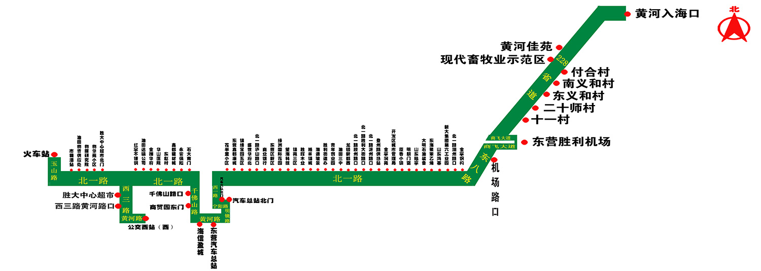 下行自公交西站始發(fā),經(jīng)黃河路、西三路、北一路、玉山路(火車站調(diào)頭)、北一路、千佛山路、黃河路、明鏡路、寧陽路、西一路、北一路、東八路、商飛大道(勝利機(jī)場(chǎng)調(diào)頭)、東八路、228省道、024鄉(xiāng)道到達(dá)終點(diǎn)站“黃河入??凇?;上行按上述路線返回。