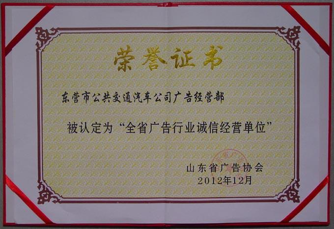 近日,市公交公司廣告部獲山東省廣告協(xié)會(huì)頒發(fā)的2012年度“全省廣告行業(yè)誠信經(jīng)營單位”證書,成為我市獲此殊榮的四家單位之一。
