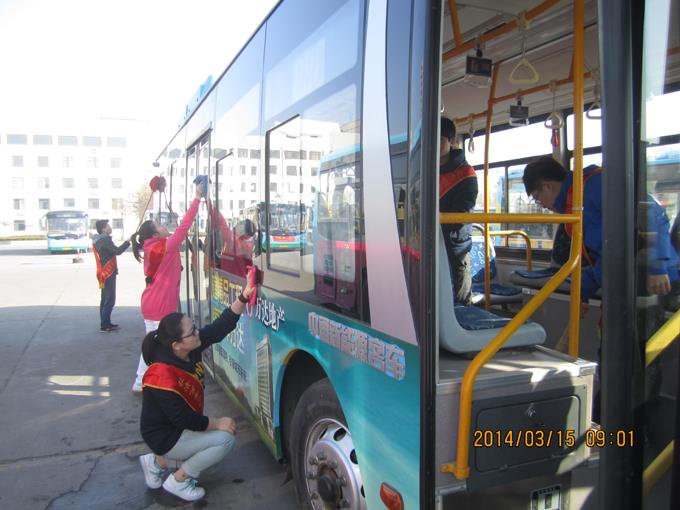 3月15日上午,市公交公司汽車一隊聯(lián)合東營市職業(yè)學院開展了學雷鋒活動。來自該校經(jīng)濟貿(mào)易與管理學院的大學生和車隊職工共計28人,分兩個小組,一組乘坐公交車上路為特需乘客服務,幫助疏導乘客;一組幫助駕駛員擦拭車身,清掃車廂衛(wèi)生。大家工作起來井然有序,有條不紊,尤其活躍在車廂為乘客服務的志愿者們,更是得到了乘客的一致好評,成為公交車上一道亮麗的風景。