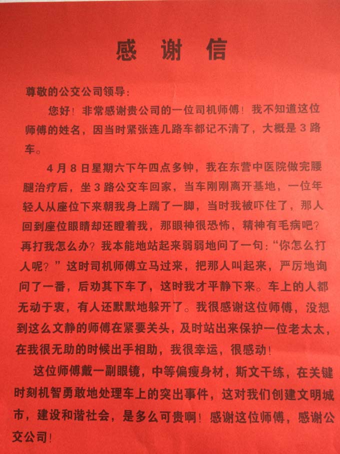 2017年4月18日下午,家住錦華四區(qū)的牟翠英老人拿著感謝信來到市公交公司汽車一隊,感謝3路車駕駛員馬慶龍師傅見義勇為的高尚品德。據(jù)車隊了解得知,4月8日下午,牟翠英老人乘坐馬慶龍駕駛的從公交西站至公交公司的3路公交車回家,車輛行駛途中,一位年輕人朝牟翠英老人身上踹了一腳,回到座位后眼睛還瞪著牟翠英老人,牟翠英老人當時很害怕。正在駕駛車輛的駕駛員馬慶龍發(fā)現(xiàn)后,在銀座購物廣場站點停下車,進一步了解情況后,勸那位年輕人下了車。