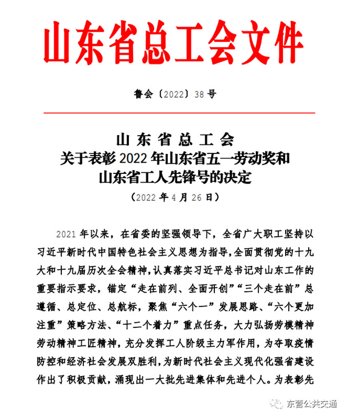 為進(jìn)一步激勵(lì)廣大職工在新時(shí)代勇?lián)率姑宫F(xiàn)新作為,“五一”前夕,山東省總工會(huì)和東營市總工會(huì)先后印發(fā)通報(bào)表彰,對省市多家先進(jìn)集體和個(gè)人進(jìn)行表彰,東營市公共交通汽車公司駕駛員黃新強(qiáng)同志被評為山東省五一勞動(dòng)獎(jiǎng)?wù)拢瑬|營市公共交通汽車公司9路車組被評為東營市工人先鋒號。