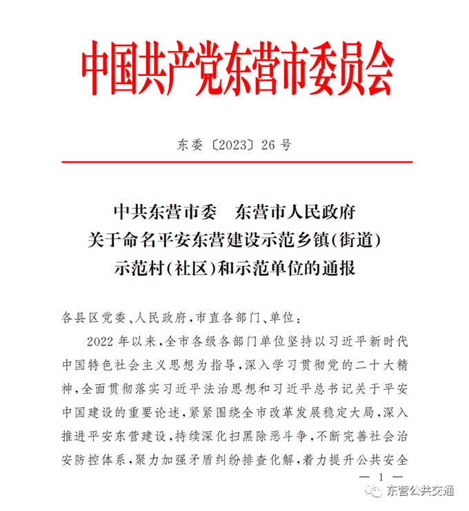 近日,市委市政府聯(lián)合印發(fā)《關(guān)于命名平安東營建設(shè)示范鄉(xiāng)鎮(zhèn)(街道)示范村(社區(qū))和示范單位的通報》(東委〔2023〕26號),市公交公司再獲表彰,被市委市政府命名為市級平安交運企業(yè)