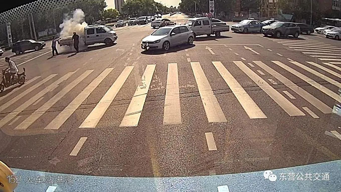 7月15日15:40分左右,東營市公交公司汽車四隊(duì)張學(xué)成師傅駕駛152路公交車行駛至北一路與西二路路口等紅燈時(shí),發(fā)現(xiàn)前方一輛私家車后斗著火,火苗竄得很高。張師傅見狀急忙拿著車內(nèi)滅火器跑下車去,對(duì)著著火處進(jìn)行滅火。
